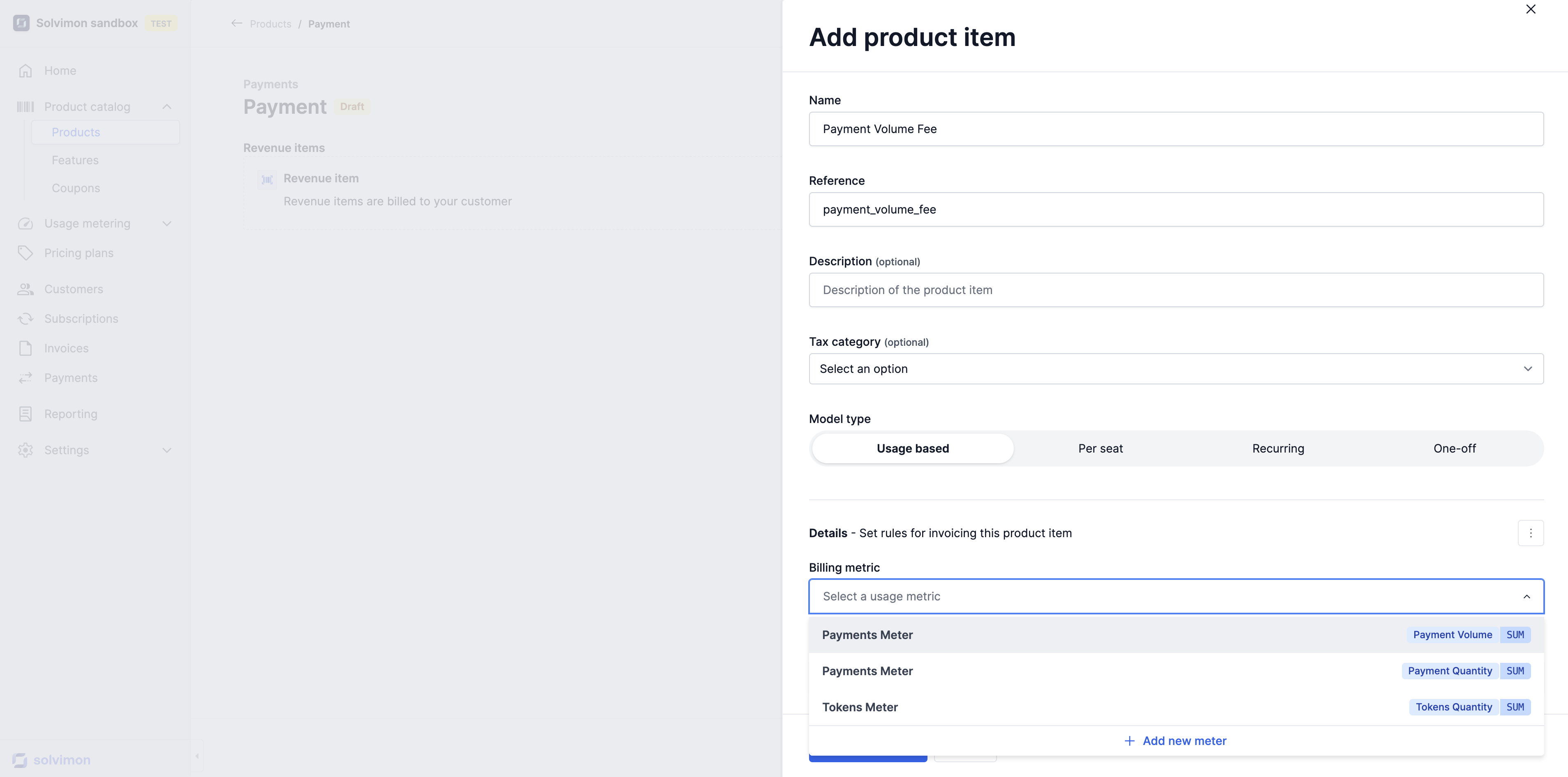 Product items can be of several charge types, including usage based, recurring, per-seat, and one-off: