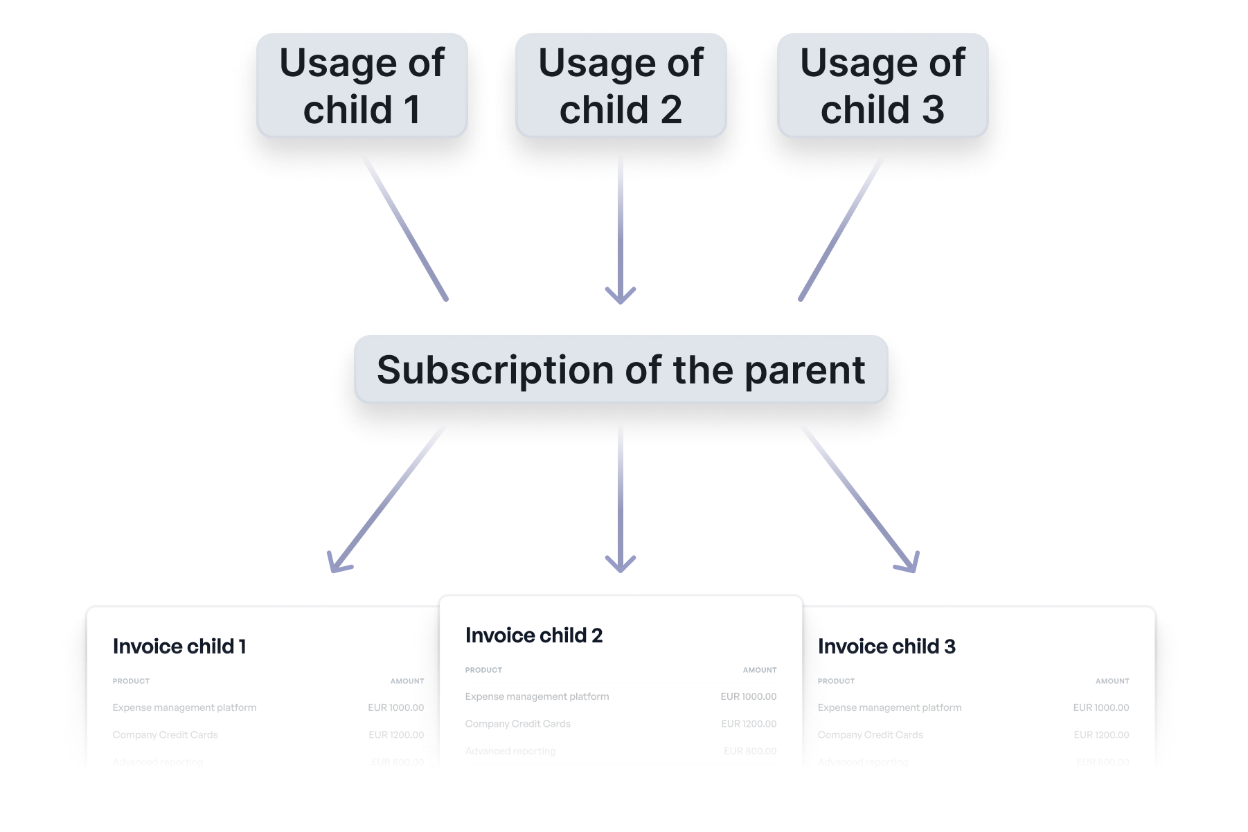 For flat fee pricing, invoicing remains unaffected. Each child entity is billed according to the agreed flat fee.