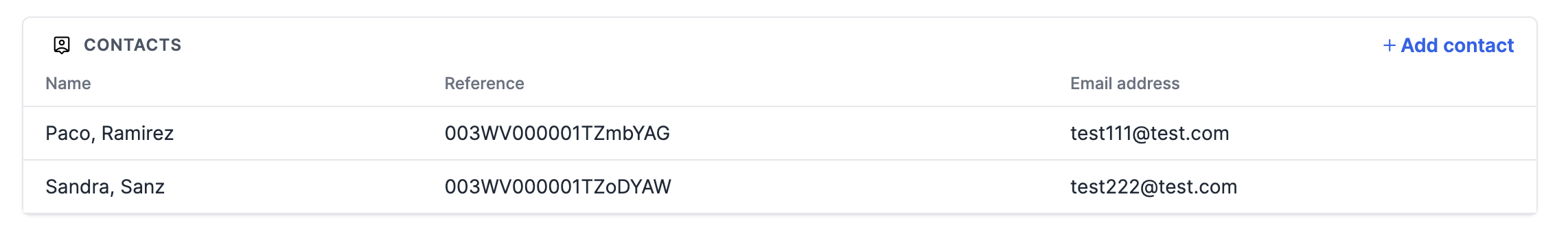 Customers can have one or more contacts connected to them. Contacts are synced from CRM or ERP systems, or created directly in the the Solvimon platform.