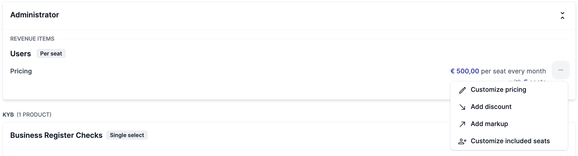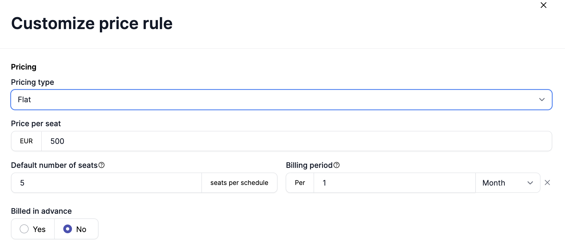 There are two types of custom settings that can be managed in a subscription. One of them is the subscription schedule configurations: settings for general tailoring of a pricing plan, such as discounts, commitments, included usage volume and included seats. These settings can easily be changed and do not change the underlying pricing structure of the plan.
