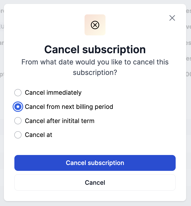 A subscription can be cancelled immediately, from the next billing period, after the initial term set in the subscription terms, or from a specific date. If a subscription is cancelled halfway the billing period and has recurring costs, these are still invoiced for the full billing period by default.
