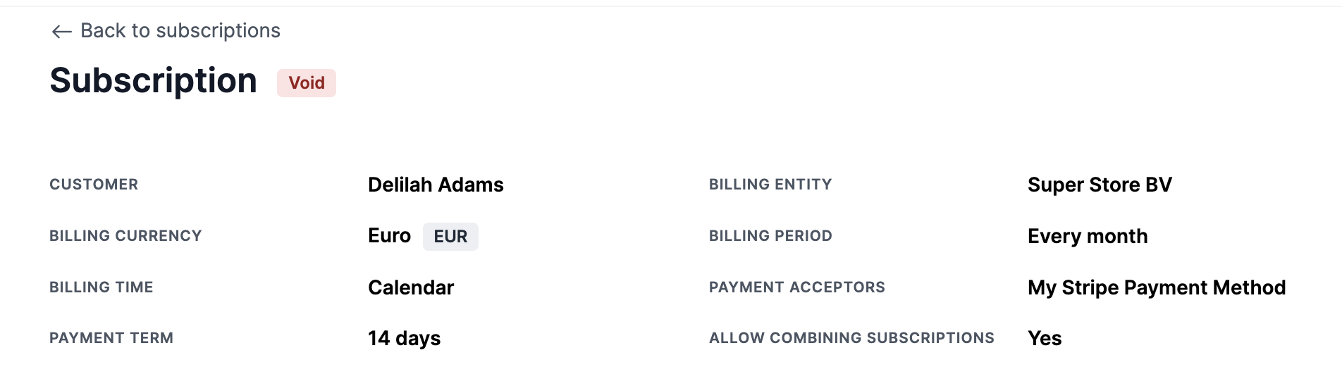 If you accidentally create a subscription, you won’t be able to delete it completely since invoices have already been generated. Instead, you can ‘Void’ the subscription. Voiding indicates that the invoice has been cancelled before it was sent out, and thus will not be set to Final nor sent to the customer.