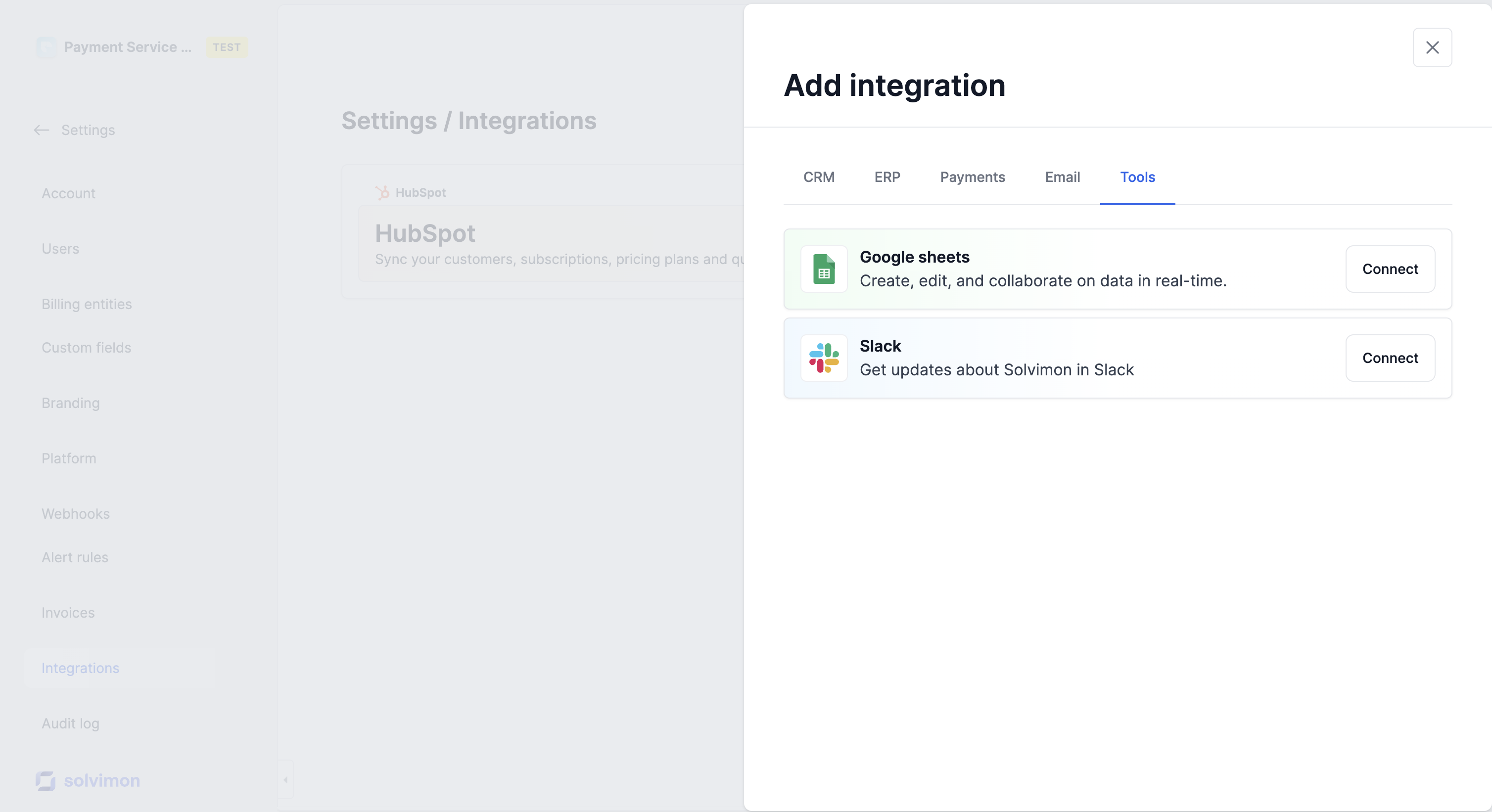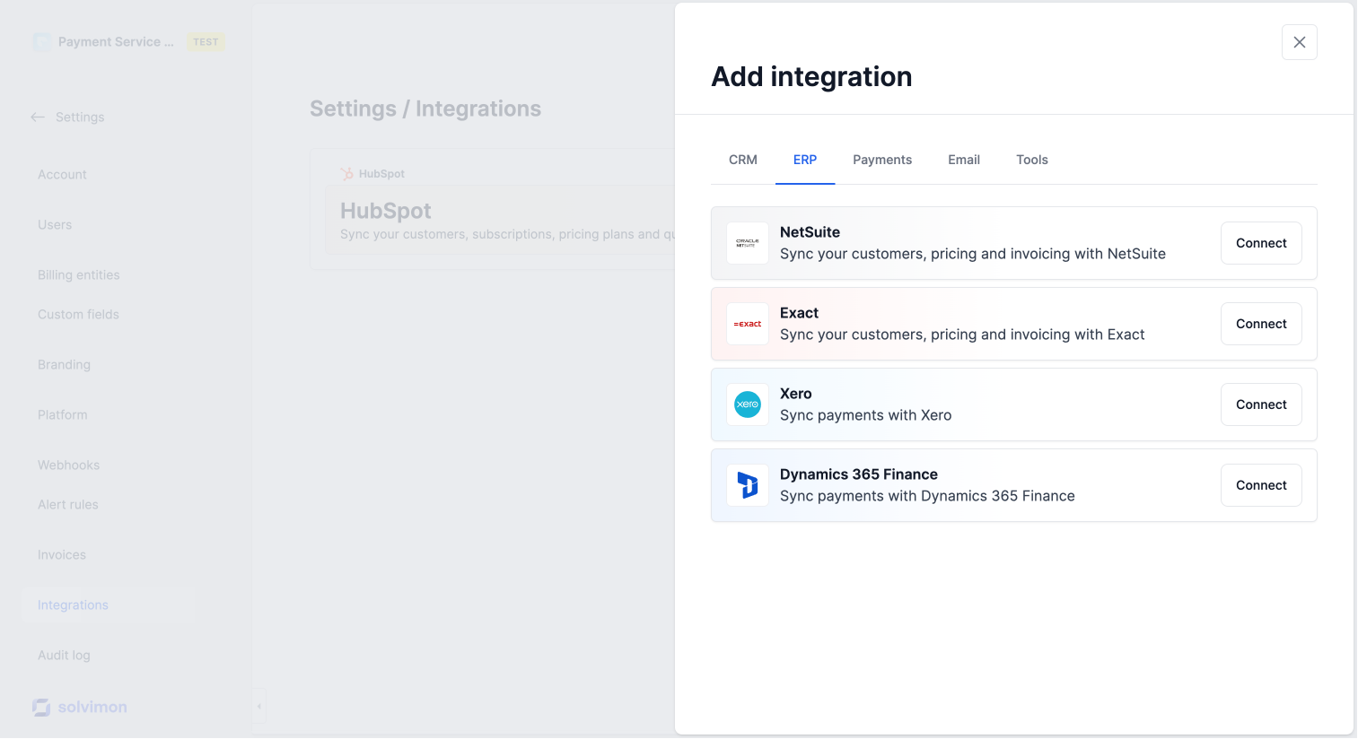 Solvimon has out-of-the-box integrations with HubSpot, Salesforce, Xero, NetSuite, Exact, Stripe, and more.