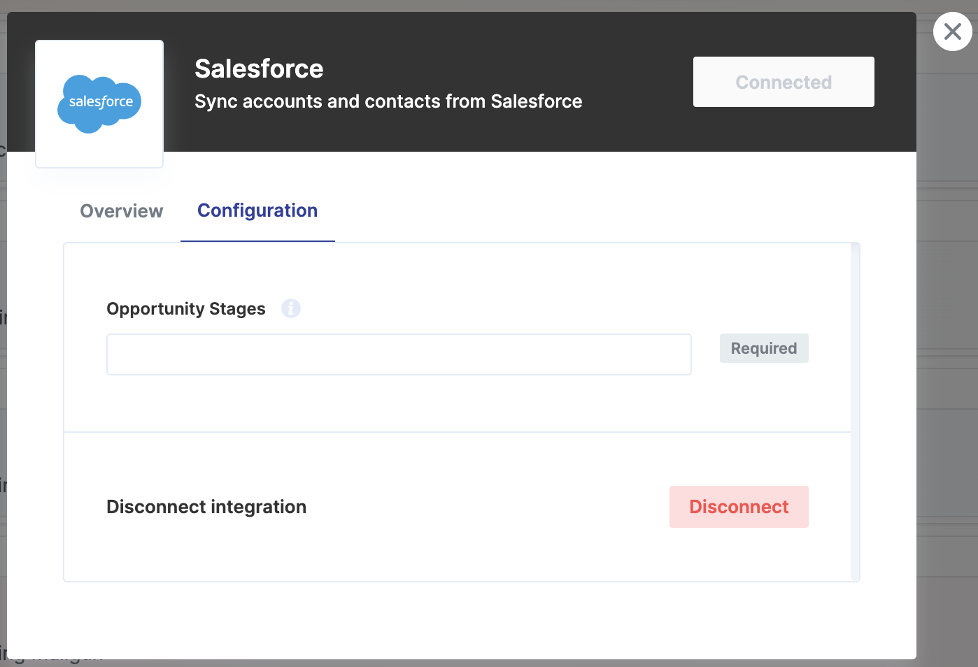 The Configuration panel will be available after the Salesforce integration is enabled. To make the sync work smoothly, it is mandatory to add the “Opportunity Stages”. This refers to which opportunity stages are important for you to consider in the synchronization. Since Salesforce offers a wide range of stages, maybe you are interested in only syncing the companies and contacts which meet certain stage criteria. For this reason, we request that you type under “Opportunity Stages” which stages we have to consider.