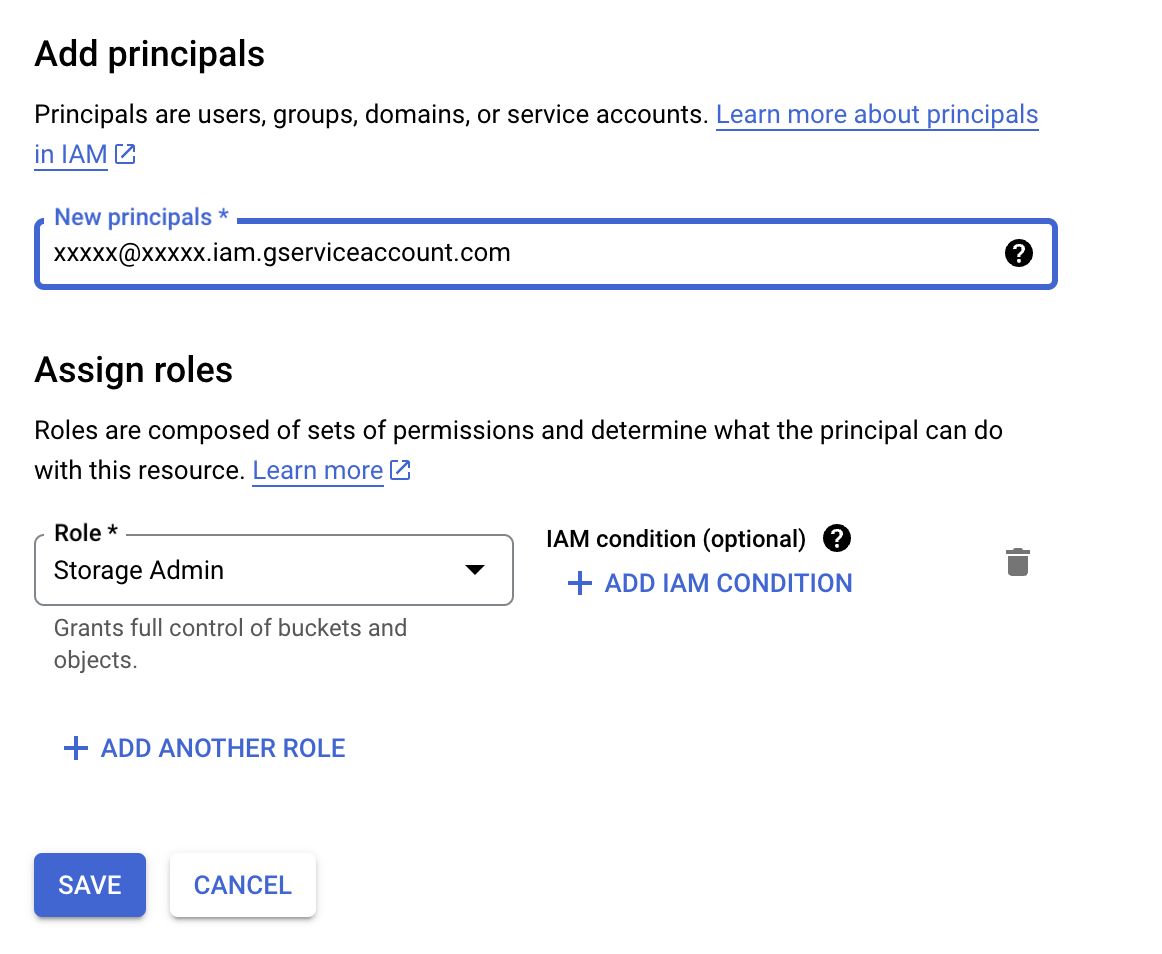 New principalsadd the Service Account that you have just created. - The role that you should grant to this Service Account is