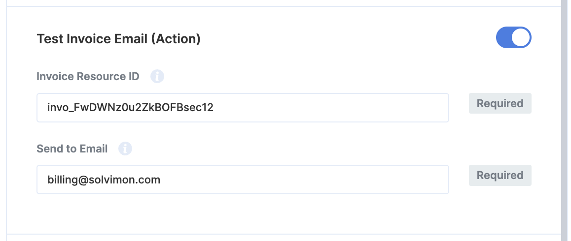 To test the set-up of the email integration, after you’ve enabled the integration, you can send out test emails. To do this you will need to enable the “Test Invoice Email (Action)” in the configuration tab and input a valid Invoice Resource ID and Send to Email. You can find a valid ID by looking at the URL of an invoice (https://desk.solvimon.com/invoices/{Invoice Resource ID}) where it is of format invo_.