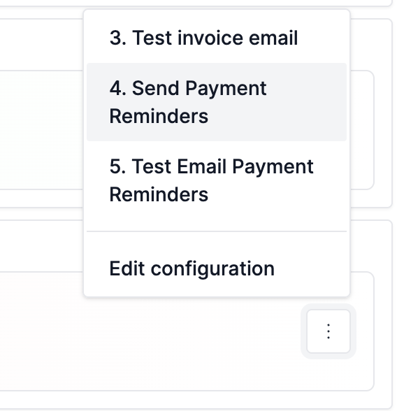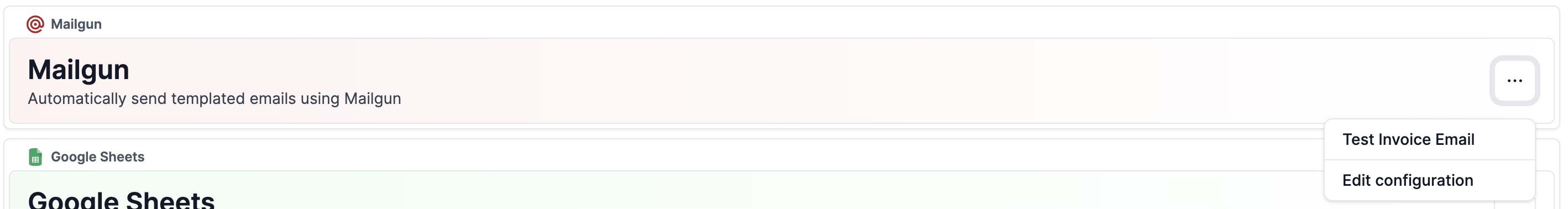 This flow can be triggered manually from the Integrations screen, three dots on the right side of the Mailgun option and by clicking on the Send payment reminders button.