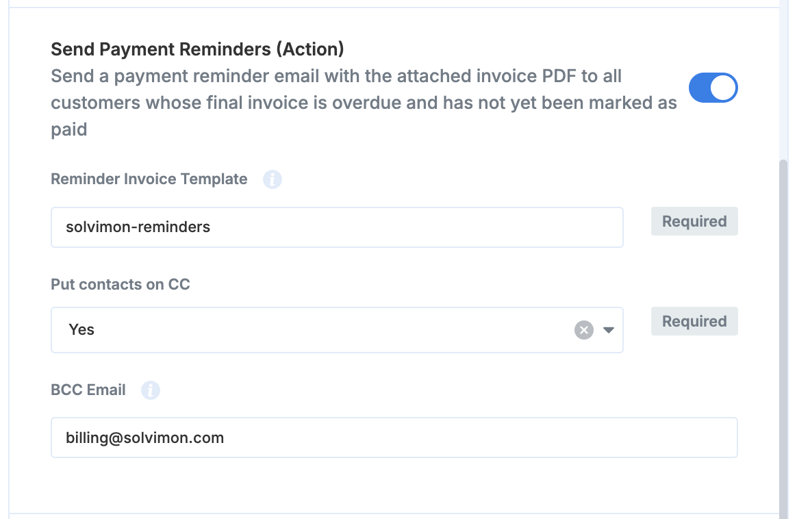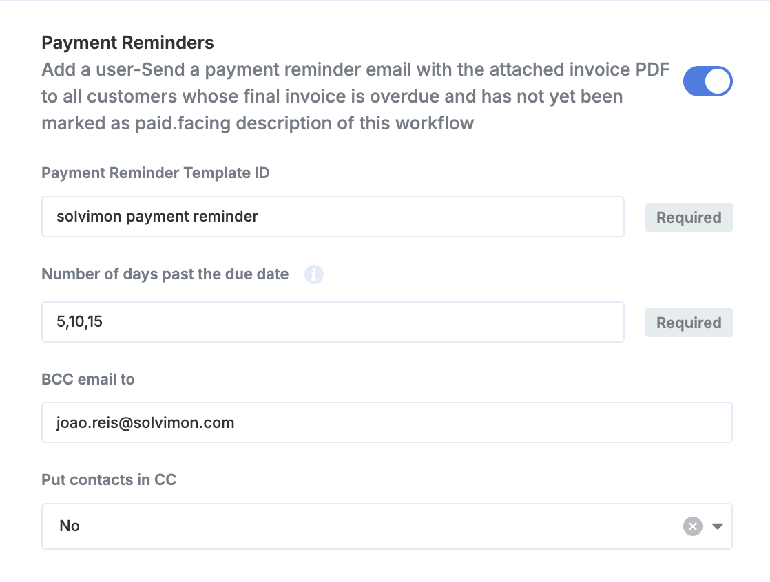 Solvimon will check everyday if there are Non-Paid invoices that match the number of days past the due date defined on the Number of days past due date field. For example, if the payment reminders should be sent for invoices whose due date has passed for 7 days, 15 days and 30 days, the input should be: