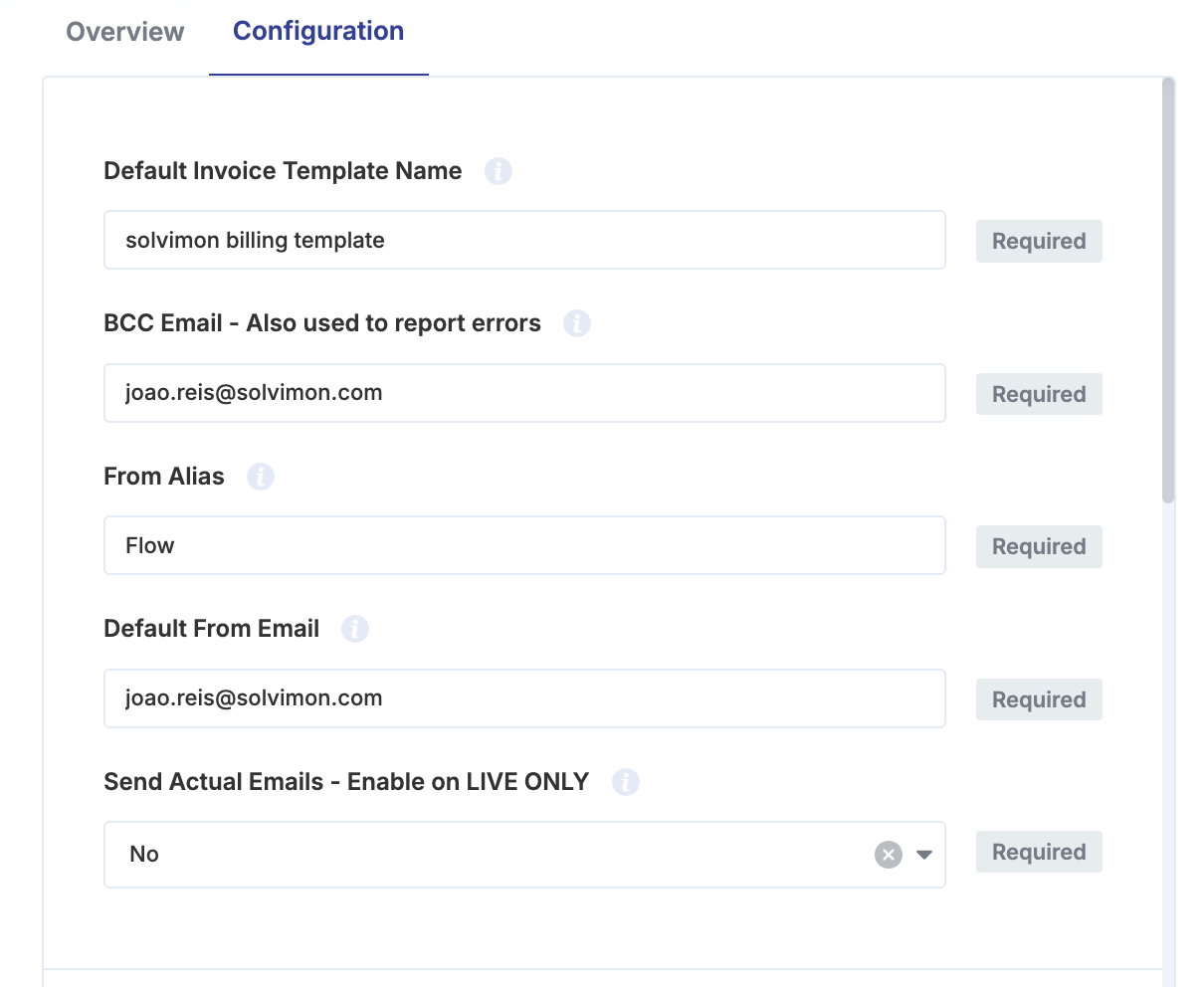 The last remaining step is to enable the flows in which you’d like email to be sent. This requires an invoice template to be filled in the Invoice Template Name and an email address to send from (in BCC Email).