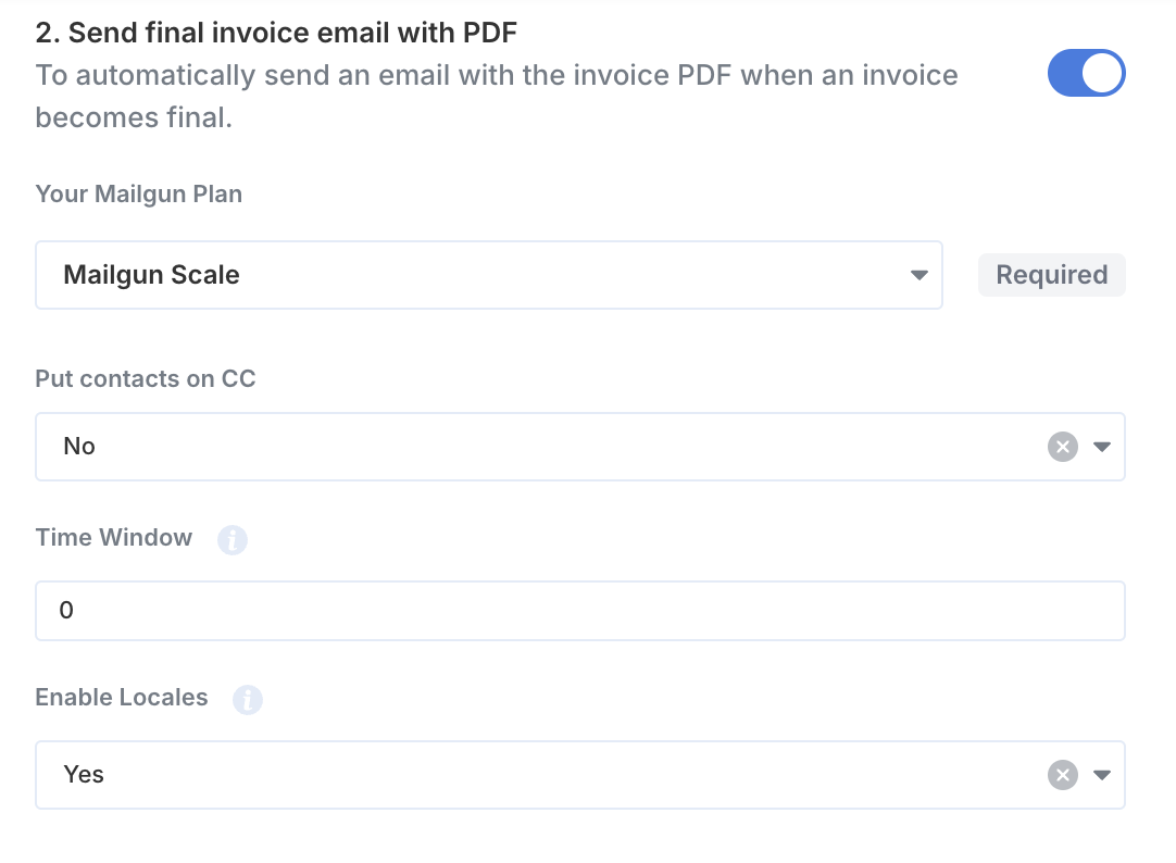 Setting a configurable time window in the Mailgun integration enables staggered invoice sending. When this window is defined (e.g., 60 minutes), a random delay is applied between invoice finalisation and email delivery, ensuring invoices are distributed evenly across the specified timeframe