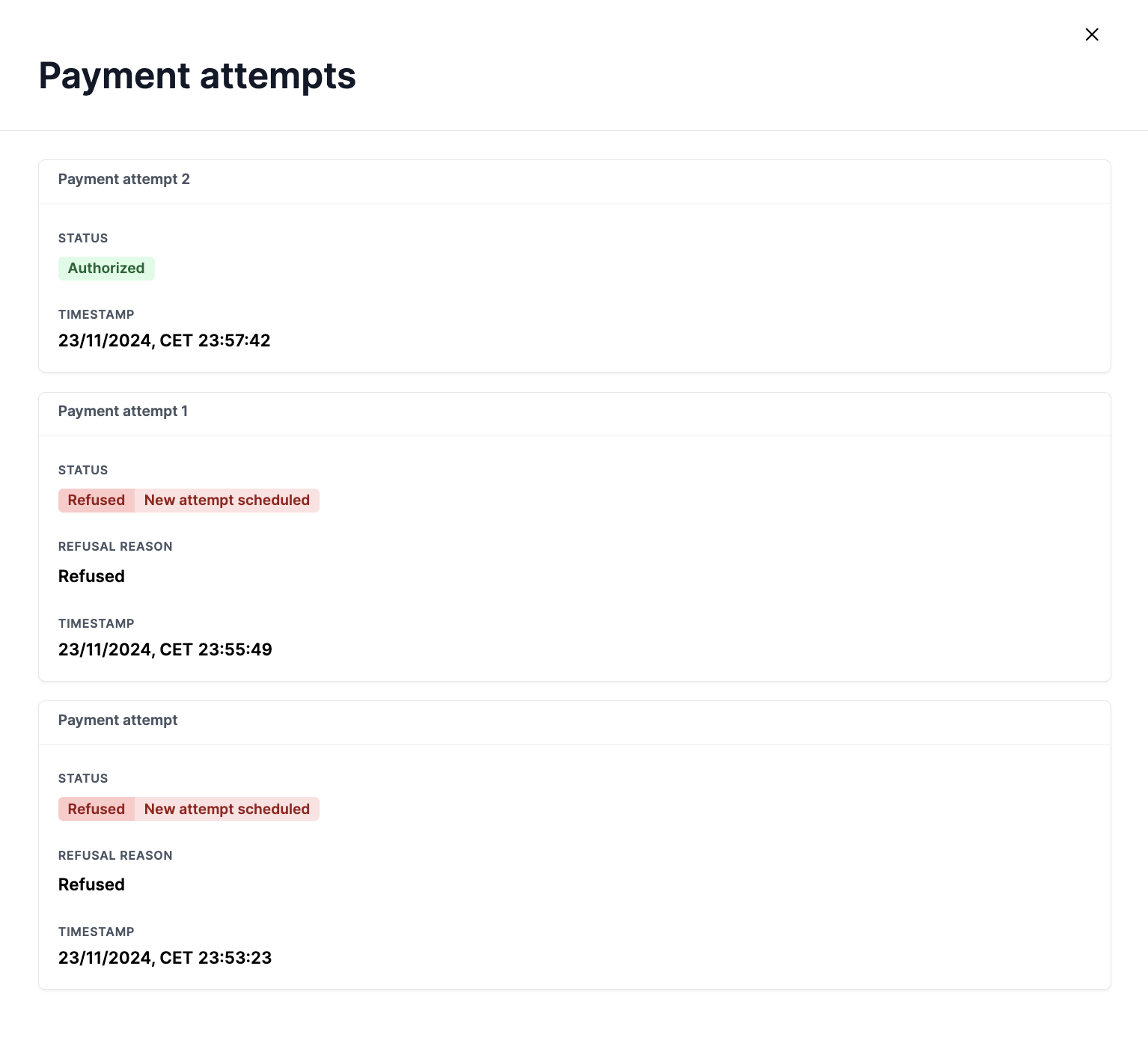 A payment can be refused, in case of card transaction, or charged back, in case of a SEPA direct debit transaction, due to many reasons. In some cases, for example, when the shopper’s account has insufficient funds, the payment may still succeed when submitted again at a later point in time. In other scenarios, for example when the shopper’s account has been closed, the payment is declined permanently.
