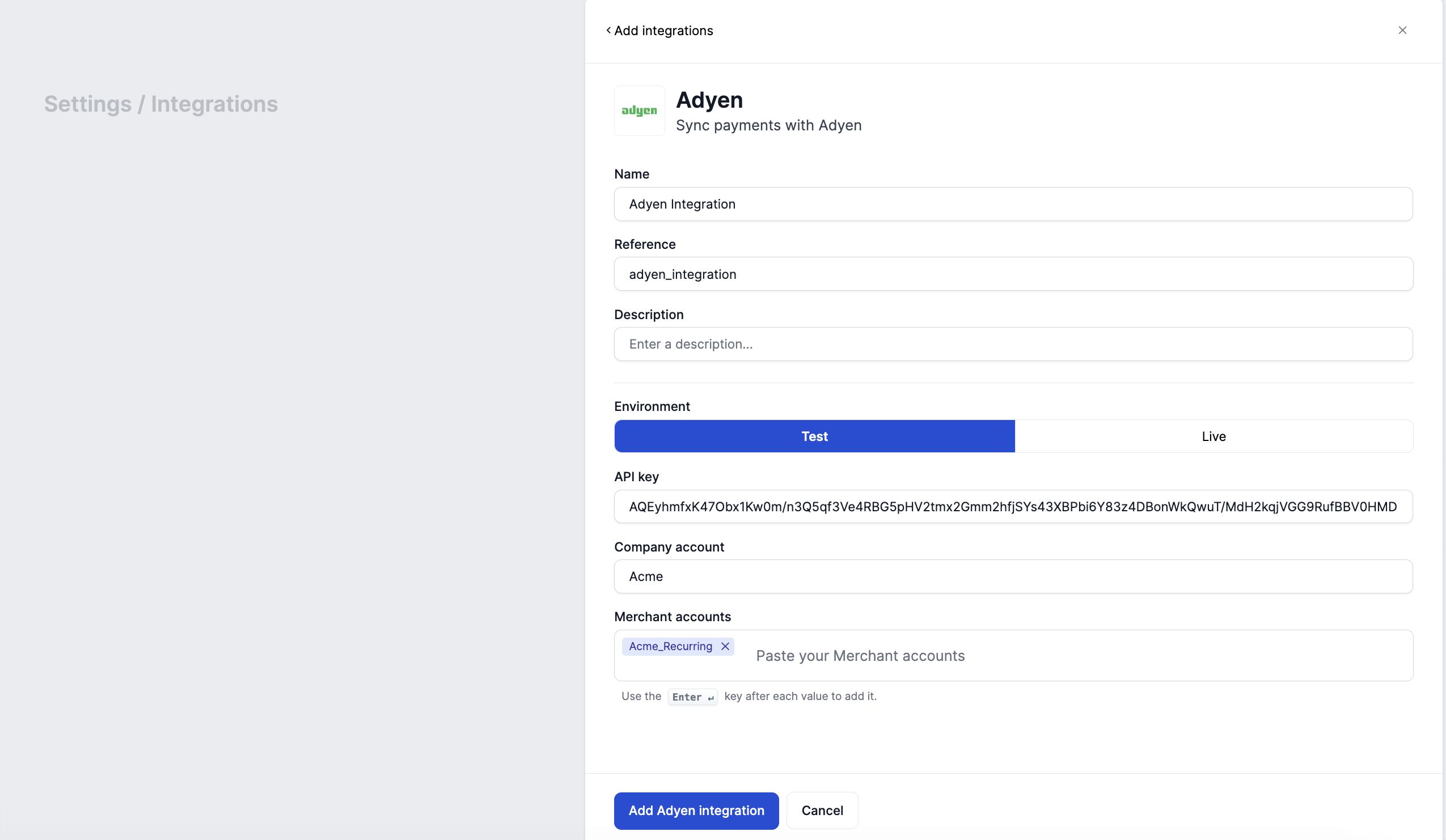 Add Adyen as Payment Acceptor to your billing entity