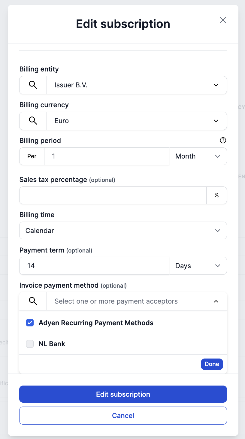 From now on you and your users can select the Adyen payment integration as a way to pay for the subscriptions’ invoices.