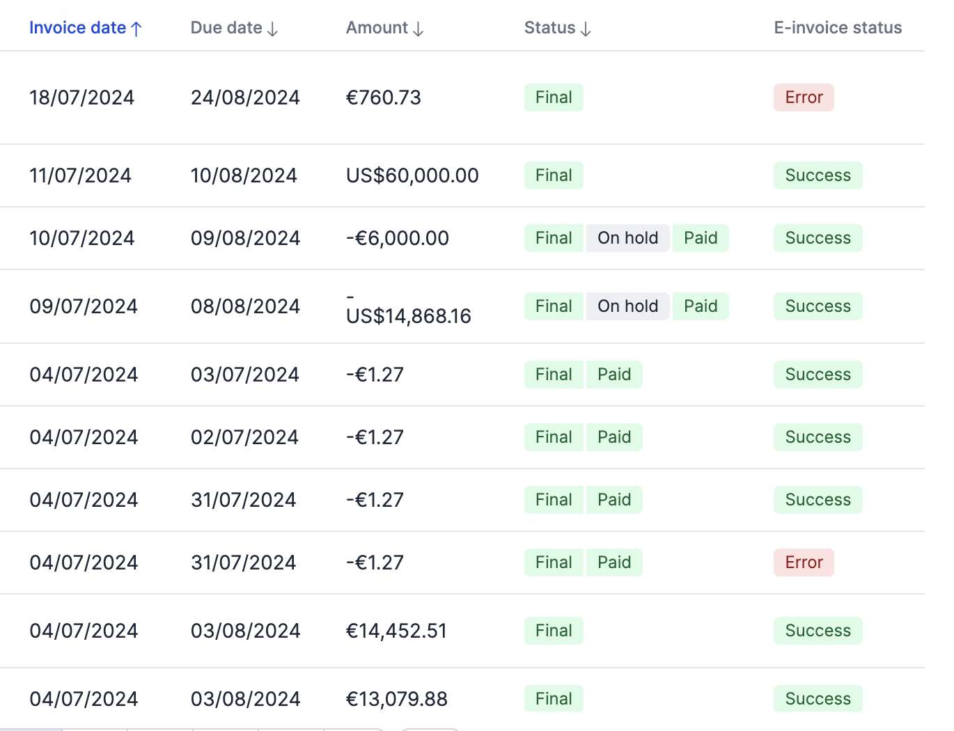 Depending on the mandate, E-invoices are sent once the invoice status is set to Final, or before that happens. Our eInvoicing solution shows whether the e-invoice is being processed, successfully accepted, or threw an error and needs to be fixed.