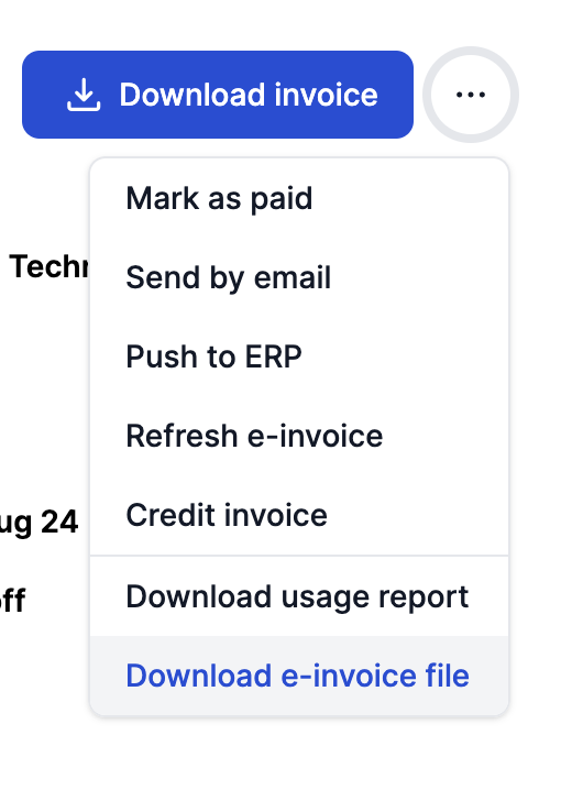 When going to a specific invoice, it is possible to download the latest e-invoice version to check what has been sent to the e-invoicing platform of the billing entity country’s platform.