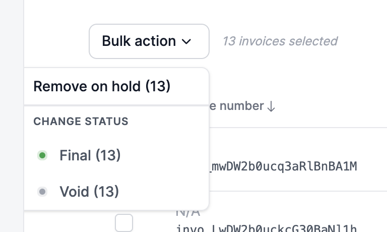 This menu presents all available actions applicable to the selected invoices. For instance, invoices in ‘Draft’ status can be transitioned to ‘Final’ or ‘Void’, while those marked as ‘On-hold’ can be removed from the hold status.