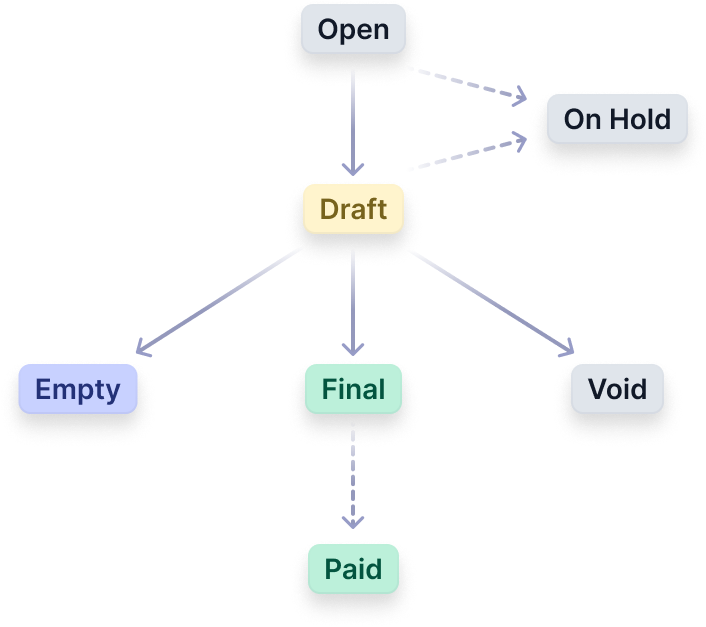 Invoices automatically transition to the Draft status when the billing period concludes. This transition occurs precisely 2 hours after the billing period ends