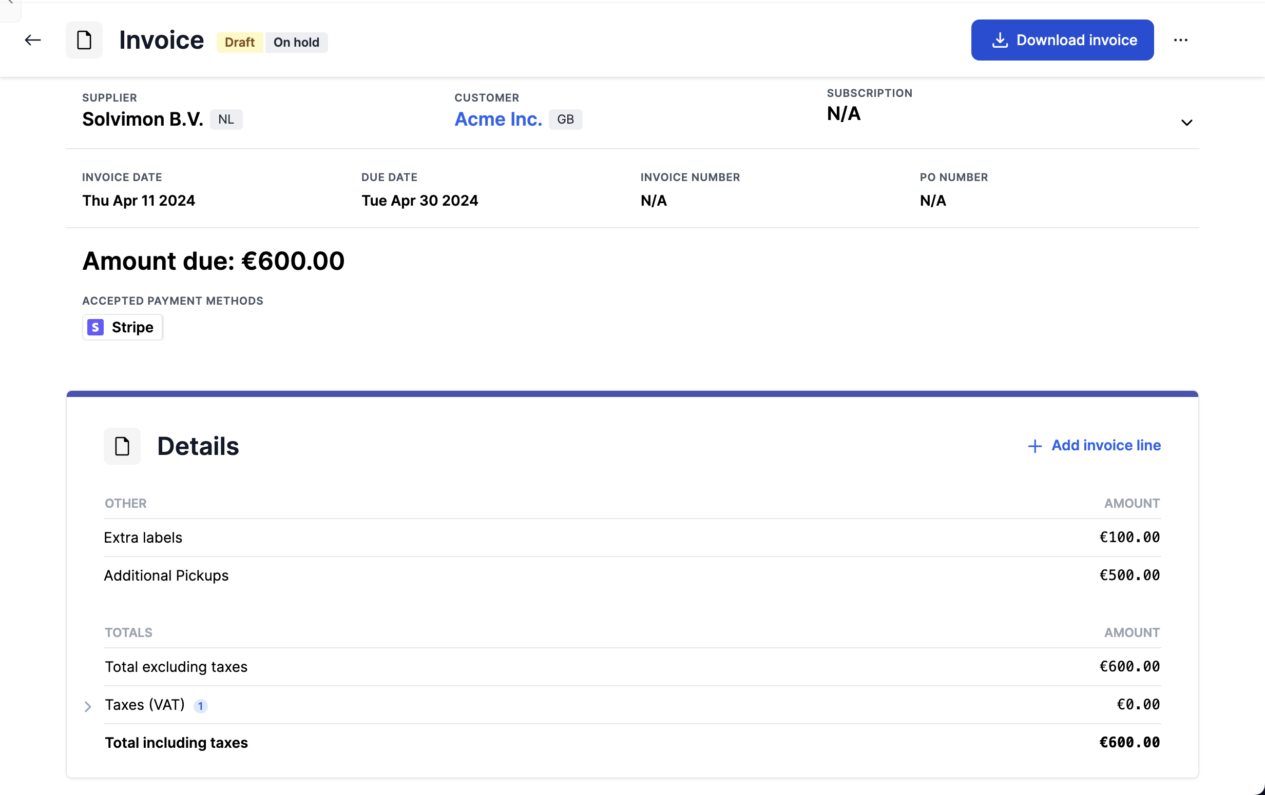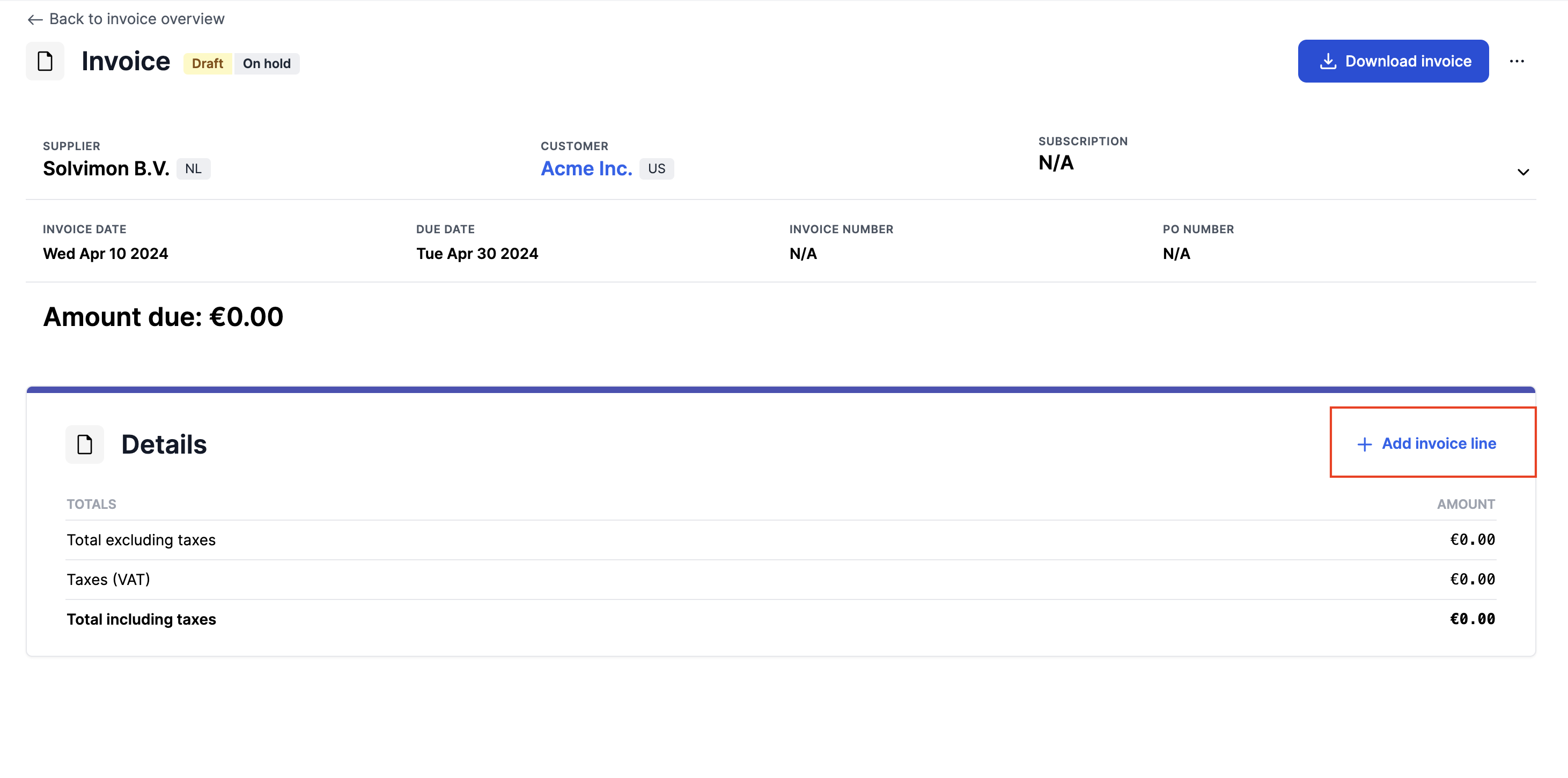 You will be asked to fill in some details such as the customer, billing entity, and other information. Once you’ve created the invoice, you can add one or several invoice lines to it.
