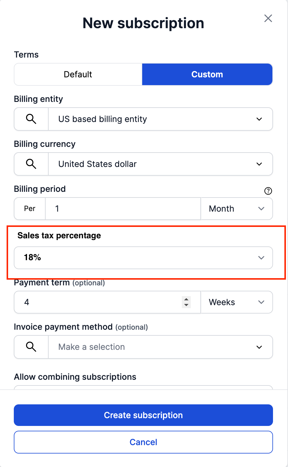 For US billing entities and customers, a sales tax percentage can be set up on the subscription level.