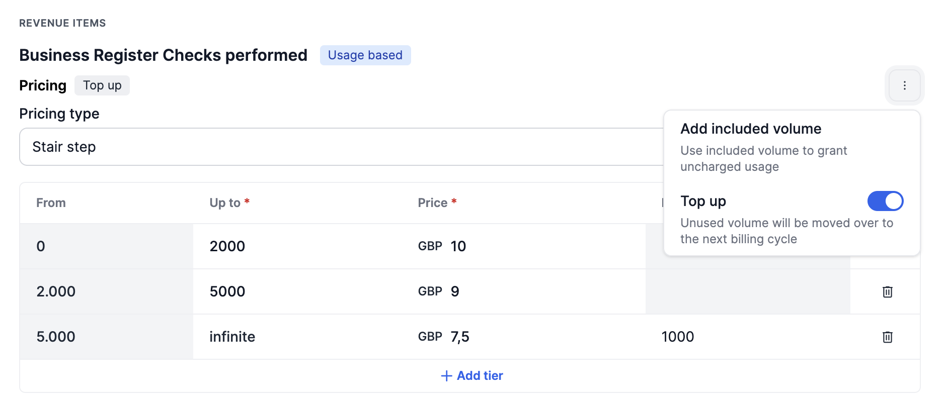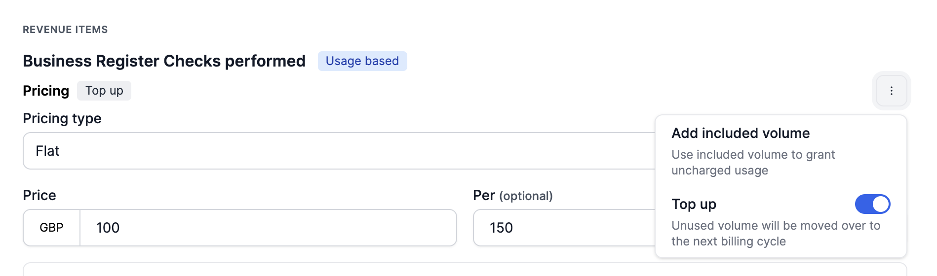 Top-up pricing allows you to set the pricing type to Top-up, enabling unused volume from the current billing cycle to carry forward to the next cycle. This feature is particularly useful for businesses that want to maximise the value of purchased units over time.