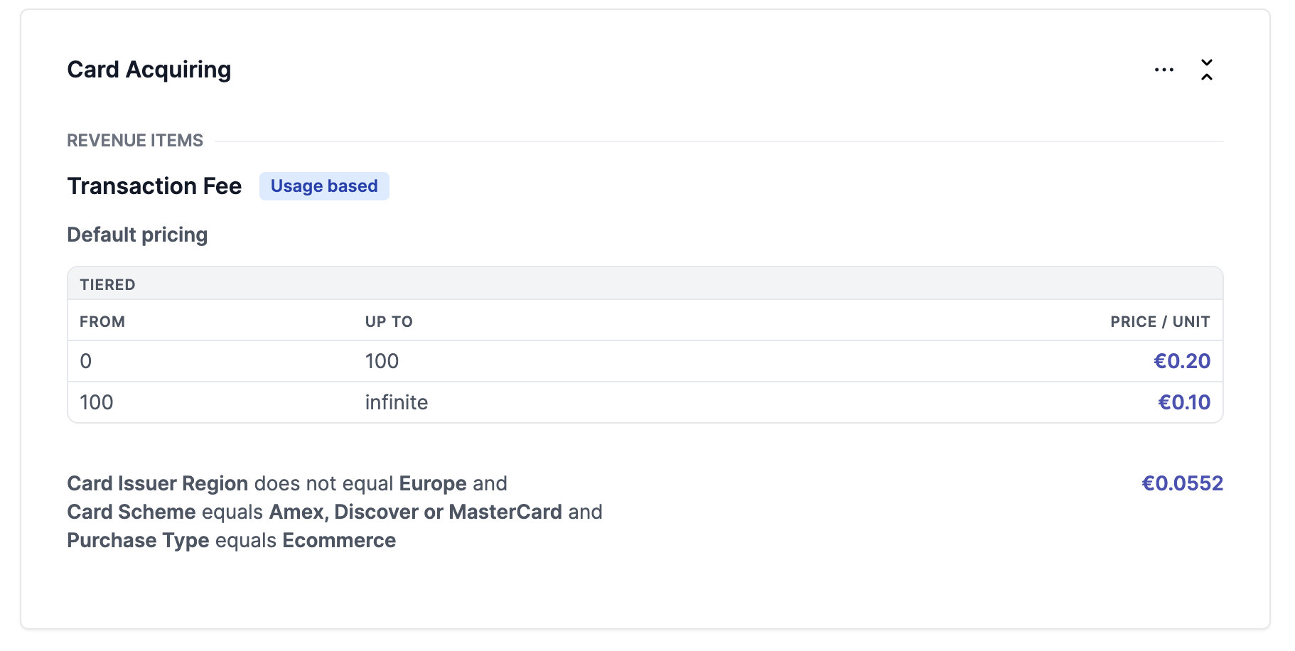 In the example below, the default pricing for transactions is tiered, but a pricing rule defines that if a meter event matches the given combination of conditions, the pricing is a flat rate of 5,52 cents.