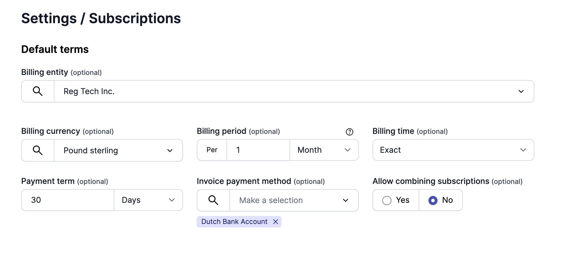 Default subscription terms are the predefined terms that are automatically assigned to a subscription upon creation. You can configure these default terms by navigating to the Subscriptions section within the Settings menu.
