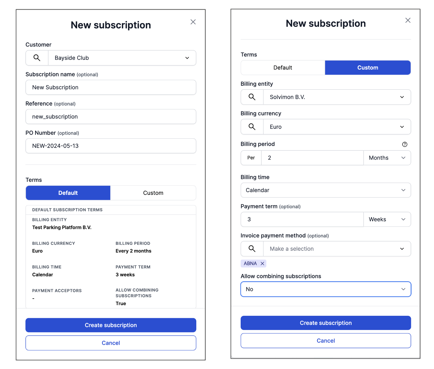 In case you’d want to change some details in the subscription terms while creating a new subscription, you can choose the ‘Custom’ button as shown below. They can be changed when clicking the ‘custom’ settings option.