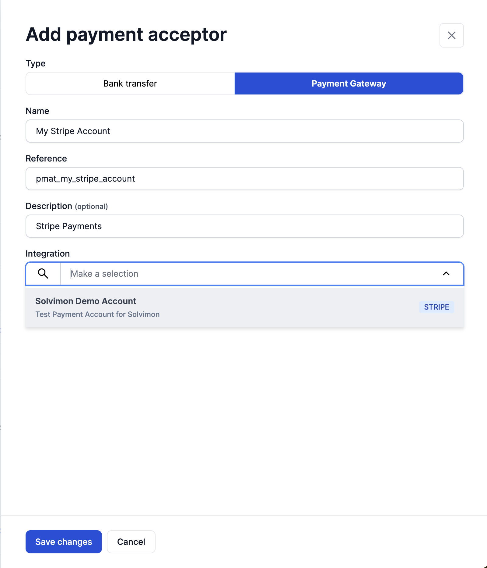 Once you add the details of the Stripe Account and select the desired Stripe account from the integration dropdown it will be configured as a payment acceptor method for that billing entity respectively