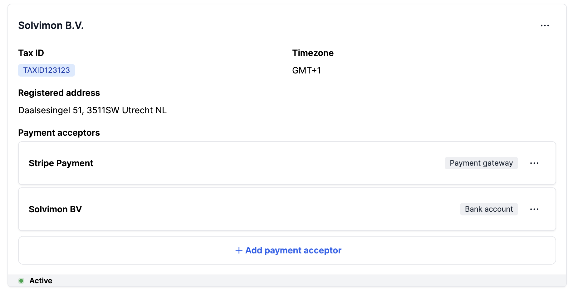 Payment acceptors are set within your billing entity. You can add multiple payment acceptors to a single billing entity. Once they are set up, they can be chosen as the payment acceptance mode in the subscription and will be shown on the invoice.