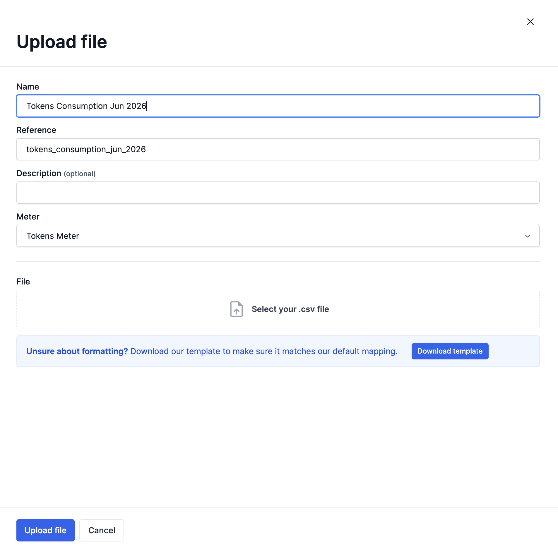 The file upload method is strictly validated, just like with the other methods. To make sure you format data in the right way check out our timestamp formatting or create an example usage event via the manual ingestion method to get the right formatting.