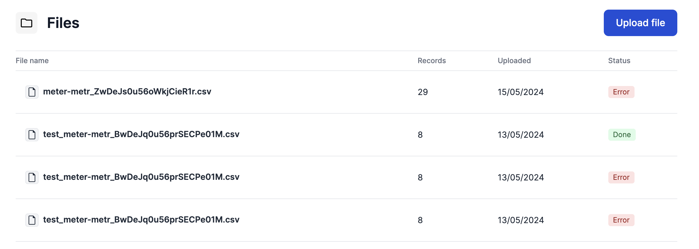 File uploads usually have a name, description, reference, upload date and time, a number of records (e.g. rows) count, and a status.