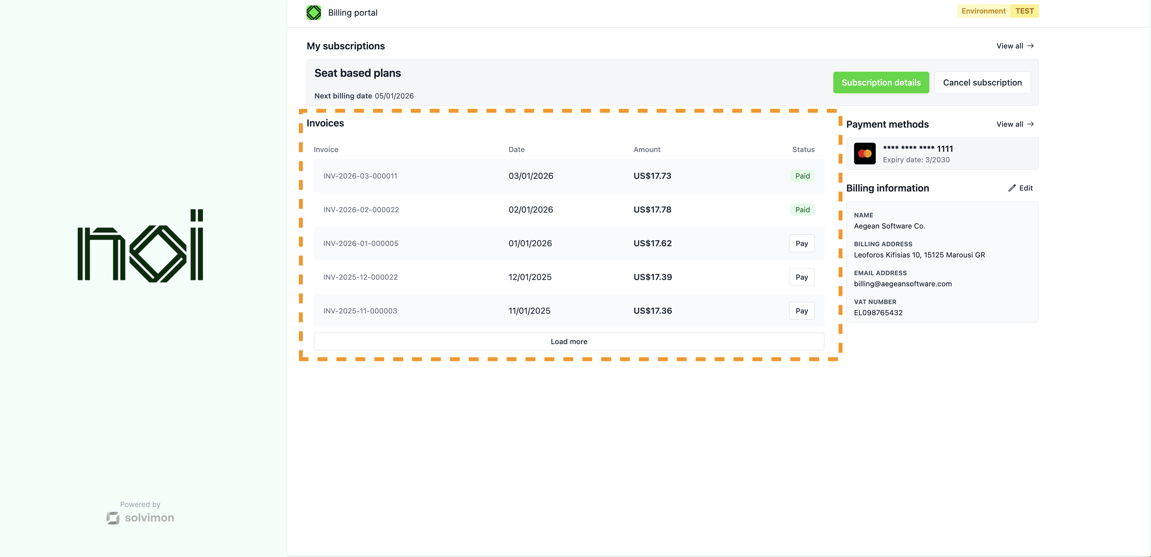 Pagination is enabled by default, loading 15 invoices per batch. Each invoice row can show a pay button, a view button, or both, depending on your configuration.
